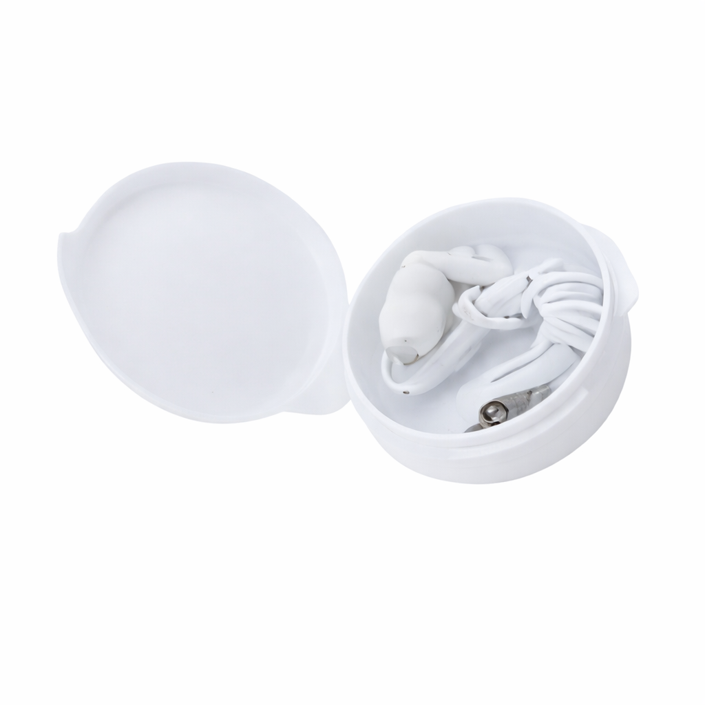 Audífonos con estuche circular de plástico. Presentación en bolsita individual.