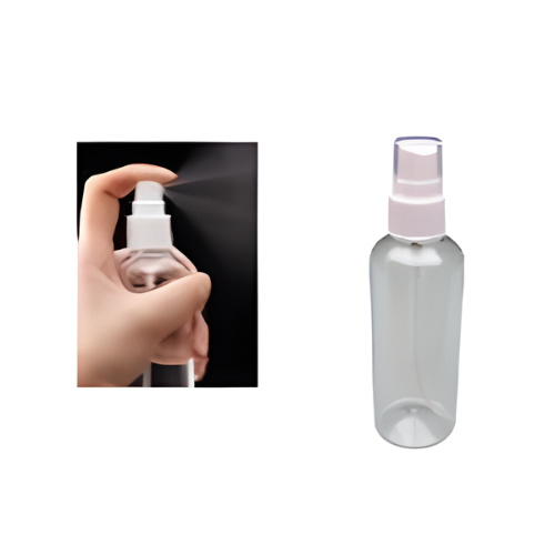 Botella spray plástica traslúcida de 100 ml con aspersor, ideal para líquidos desinfectantes. Presentación individual.