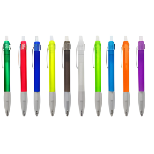 Lapicero plástico promocional con tinta azul y presentación individual.