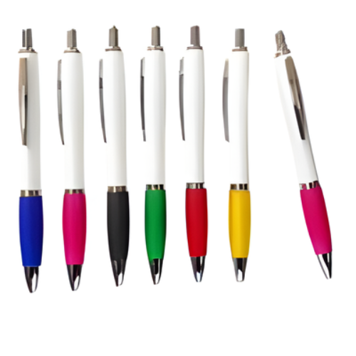 Lapicero plástico retráctil con cuerpo blanco sólido, goma antideslizante y tinta azul.
