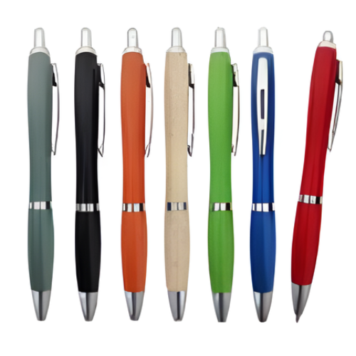 Lapicero retráctil de fibra de trigo con detalles plateados y tinta azul.