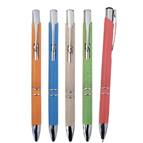 Lapicero retráctil de fibra de trigo con detalles plateados y tinta azul.