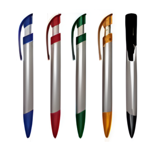 Lapicero plástico retráctil de cuerpo plateado con clip y punta traslúcida.