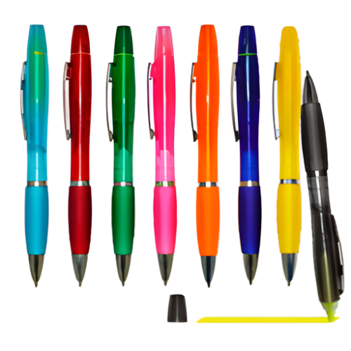 Lapicero plástico transparente con resaltador amarillo y tinta azul.