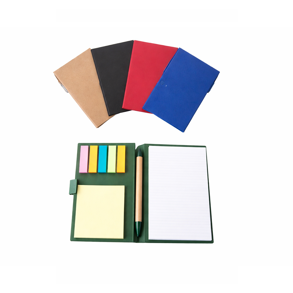Libreta ecológica, contiene post it, hojas y lapicero.