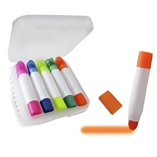 Set de resaltadores de 5 piezas en estuche compacto. Ideal para estudio y oficina. Presentación en bolsita plástica transparente. Contenido: 100 unidades por caja.