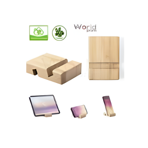 Soporte de bambú para celular o tablet, resistente y elegante.